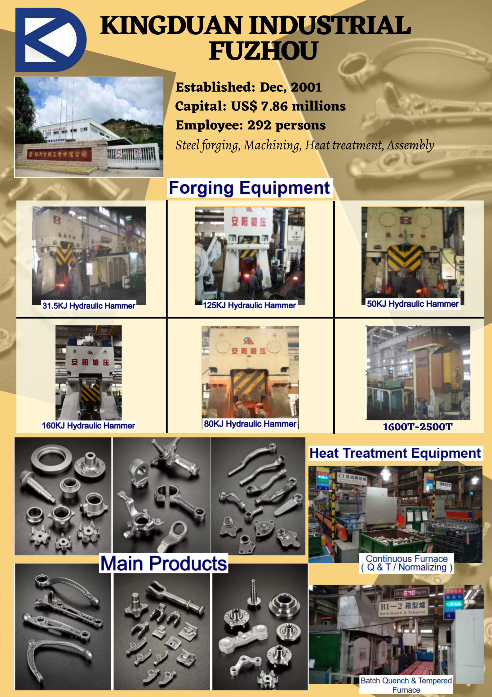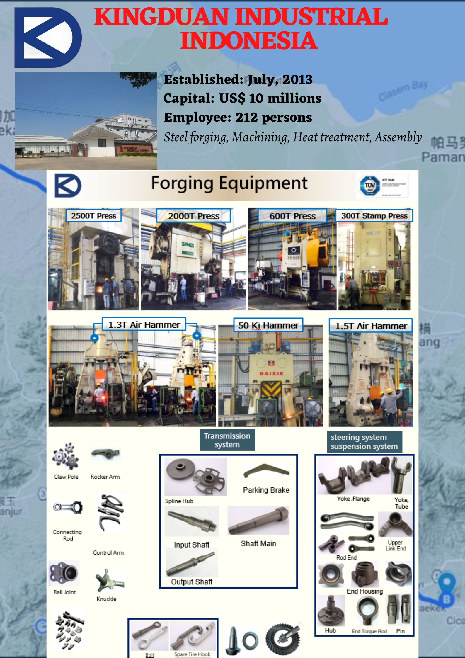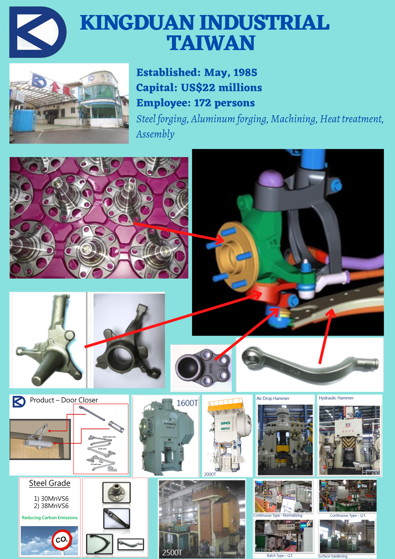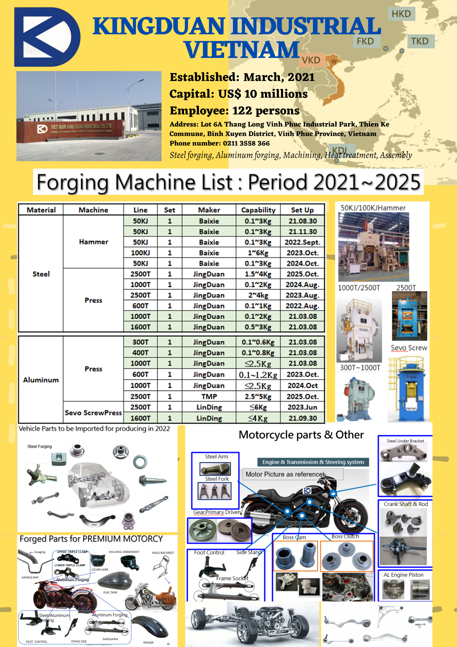 Bắt đầu với hai chiếc búa rèn nhỏ và cung cấp dịch vụ cho khách hàng Đài Loan, tập đoàn King Duan thành lập trụ sở chính đầu tiên tại Đài Loan năm 1985. Ngoài trụ sở chính, chúng tôi còn có 4 trụ sở khác ở Hải An (Trung Quốc), Fuzhou (Trung Quốc), Bandun (Indonesia). Việt Nam King Duan (VKD) được thành lập vào năm 2021, là xưởng đầu tiên tại Việt Nam và là xưởng thứ 5 của tập đoàn King Duan trên thế giới. Chúng tôi mong muốn King Duan không chỉ là cung cấp rèn nóng mà còn trở thành đối tác tốt nhất cung cấp giải pháp tổng thể cho quý khách hàng.